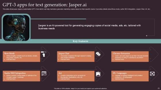 This slide showcases Jasper.ai automation GPT 3 tool which can help marketers generate marketing copies based on their specific needs. It provides details about Boss mode, surfer SEO integration, Jasper Chat, Art, etc. Formulating a presentation can take up a lot of effort and time, so the content and message should always be the primary focus. The visuals of the PowerPoint can enhance the presenters message, so our Comprehensive Resource Guide To Master GPT 3 GPT 3 Apps For Text Generation Jasper Ai Demonstration PDF was created to help save time. Instead of worrying about the design, the presenter can concentrate on the message while our designers work on creating the ideal templates for whatever situation is needed. Slidegeeks has experts for everything from amazing designs to valuable content, we have put everything into Comprehensive Resource Guide To Master GPT 3 GPT 3 Apps For Text Generation Jasper Ai Demonstration PDF