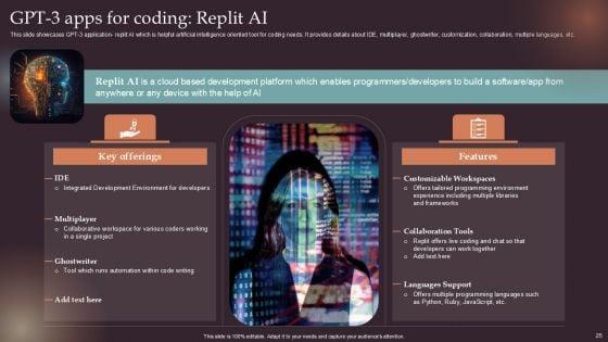 This slide showcases GPT-3 application- replit AI which is helpful artificial intelligence oriented tool for coding needs. It provides details about IDE, multiplayer, ghostwriter, customization, collaboration, multiple languages, etc. Do you have an important presentation coming up Are you looking for something that will make your presentation stand out from the rest Look no further than Comprehensive Resource Guide To Master GPT 3 GPT 3 Apps For Coding Replit AI Icons PDF. With our professional designs, you can trust that your presentation will pop and make delivering it a smooth process. And with Slidegeeks, you can trust that your presentation will be unique and memorable. So why wait Grab Comprehensive Resource Guide To Master GPT 3 GPT 3 Apps For Coding Replit AI Icons PDF today and make your presentation stand out from the rest.