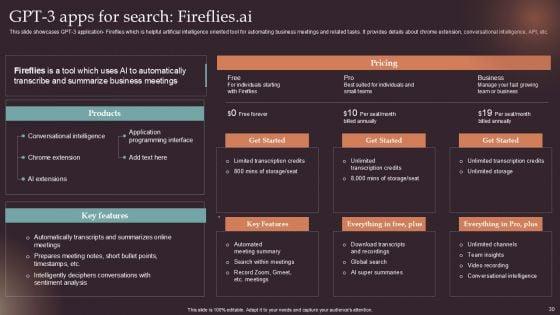 This slide showcases GPT 3 application  Fireflies which is helpful artificial intelligence oriented tool for automating business meetings and related tasks. It provides details about chrome extension, conversational intelligence, API, etc. Are you in need of a template that can accommodate all of your creative concepts This one is crafted professionally and can be altered to fit any style. Use it with Google Slides or PowerPoint. Include striking photographs, symbols, depictions, and other visuals. Fill, move around, or remove text boxes as desired. Test out color palettes and font mixtures. Edit and save your work, or work with colleagues. Download Comprehensive Resource Guide To Master GPT 3 GPT 3 Apps For Search Fireflies Ai Introduction PDF and observe how to make your presentation outstanding. Give an impeccable presentation to your group and make your presentation unforgettable.