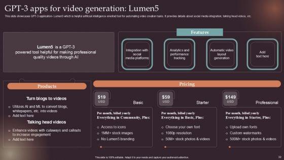 This slide showcases GPT 3 application  Lumen5 which is helpful artificial intelligence oriented tool for automating video creation tasks. It provides details about social media integration, talking head videos, etc. Coming up with a presentation necessitates that the majority of the effort goes into the content and the message you intend to convey. The visuals of a PowerPoint presentation can only be effective if it supplements and supports the story that is being told. Keeping this in mind our experts created Comprehensive Resource Guide To Master GPT 3 GPT 3 Apps For Video Generation Lumen5 Themes PDF to reduce the time that goes into designing the presentation. This way, you can concentrate on the message while our designers take care of providing you with the right template for the situation.