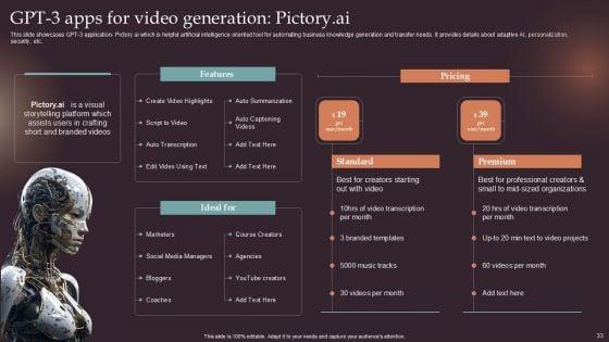 This slide showcases GPT 3 application  Pictory.ai which is helpful artificial intelligence oriented tool for automating business knowledge generation and transfer needs. It provides details about adaptive AI, personalization, security, etc. This modern and well arranged Comprehensive Resource Guide To Master GPT 3 GPT 3 Apps For Video Generation Pictory Ai Designs PDF provides lots of creative possibilities. It is very simple to customize and edit with the Powerpoint Software. Just drag and drop your pictures into the shapes. All facets of this template can be edited with Powerpoint no extra software is necessary. Add your own material, put your images in the places assigned for them, adjust the colors, and then you can show your slides to the world, with an animated slide included.