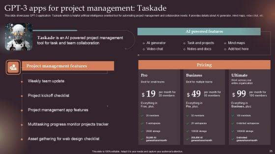 This slide showcases GPT 3 application  Taskade which is helpful artificial intelligence oriented tool for automating project management and collaboration needs. It provides details about AI generator, mind maps, video chat, etc. If you are looking for a format to display your unique thoughts, then the professionally designed Comprehensive Resource Guide To Master GPT 3 GPT 3 Apps For Project Management Taskade Microsoft PDF is the one for you. You can use it as a Google Slides template or a PowerPoint template. Incorporate impressive visuals, symbols, images, and other charts. Modify or reorganize the text boxes as you desire. Experiment with shade schemes and font pairings. Alter, share or cooperate with other people on your work. Download Comprehensive Resource Guide To Master GPT 3 GPT 3 Apps For Project Management Taskade Microsoft PDF and find out how to give a successful presentation. Present a perfect display to your team and make your presentation unforgettable.