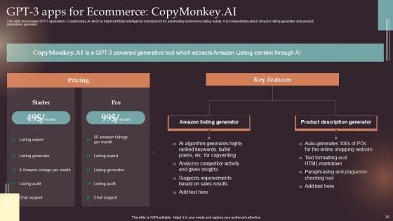 This slide showcases GPT-3 application- CopyMonkey.AI which is helpful artificial intelligence oriented tool for automating ecommerce listing needs. It provides details about Amazon listing generator and product description generator Whether you have daily or monthly meetings, a brilliant presentation is necessary. Comprehensive Resource Guide To Master GPT 3 GPT 3 Apps For Ecommerce Copymonkey Ai Professional PDF can be your best option for delivering a presentation. Represent everything in detail using Comprehensive Resource Guide To Master GPT 3 GPT 3 Apps For Ecommerce Copymonkey Ai Professional PDF and make yourself stand out in meetings. The template is versatile and follows a structure that will cater to your requirements. All the templates prepared by Slidegeeks are easy to download and edit. Our research experts have taken care of the corporate themes as well. So, give it a try and see the results.