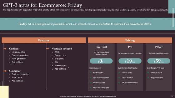 This slide showcases GPT-3 application- Friday which is helpful artificial intelligence oriented tool for automating marketing copywriting needs. It provides details about idea generation, content generation, SEO, pay per click, etc. Find highly impressive Comprehensive Resource Guide To Master GPT 3 GPT 3 Apps For Ecommerce Friday Professional PDF on Slidegeeks to deliver a meaningful presentation. You can save an ample amount of time using these presentation templates. No need to worry to prepare everything from scratch because Slidegeeks experts have already done a huge research and work for you. You need to download Comprehensive Resource Guide To Master GPT 3 GPT 3 Apps For Ecommerce Friday Professional PDF for your upcoming presentation. All the presentation templates are 100 percent editable and you can change the color and personalize the content accordingly. Download now.