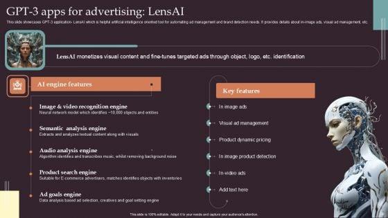 This slide showcases GPT-3 application- LensAI which is helpful artificial intelligence oriented tool for automating ad management and brand detection needs. It provides details about in-image ads, visual ad management, etc. Do you have to make sure that everyone on your team knows about any specific topic I yes, then you should give Comprehensive Resource Guide To Master GPT 3 GPT 3 Apps For Advertising Lensai Mockup PDF a try. Our experts have put a lot of knowledge and effort into creating this impeccable Comprehensive Resource Guide To Master GPT 3 GPT 3 Apps For Advertising Lensai Mockup PDF. You can use this template for your upcoming presentations, as the slides are perfect to represent even the tiniest detail. You can download these templates from the Slidegeeks website and these are easy to edit. So grab these today.
