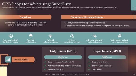 This slide showcases GPT-3 application- SuperBuzz which is helpful artificial intelligence oriented tool for automating content generation. It provides details about full stack website integration, reports, etc. Get a simple yet stunning designed Comprehensive Resource Guide To Master GPT 3 GPT 3 Apps For Advertising Superbuzz Infographics PDF. It is the best one to establish the tone in your meetings. It is an excellent way to make your presentations highly effective. So, download this PPT today from Slidegeeks and see the positive impacts. Our easy to edit Comprehensive Resource Guide To Master GPT 3 GPT 3 Apps For Advertising Superbuzz Infographics PDF can be your go to option for all upcoming conferences and meetings. So, what are you waiting for Grab this template today.