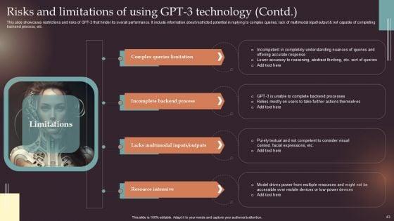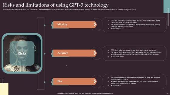 This slide showcases restrictions and risks of GPT 3 that hinder its overall performance. It include information about mimicry of human text, decreased accuracy in answers and general bias. Take your projects to the next level with our ultimate collection of Comprehensive Resource Guide To Master GPT 3 Risks And Limitations Of Using GPT 3 Technology Slides PDF. Slidegeeks has designed a range of layouts that are perfect for representing task or activity duration, keeping track of all your deadlines at a glance. Tailor these designs to your exact needs and give them a truly corporate look with your own brand colors they will make your projects stand out from the rest.