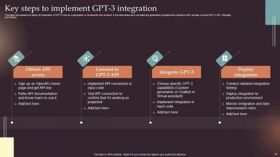 This slide showcases key steps for integration of GPT 3 into an organization or its specific tech product. It provides steps such as obtaining application programming interface API access, connect GPT 3 API, integrate and deploy. Explore a selection of the finest Comprehensive Resource Guide To Master GPT 3 Key Steps To Implement GPT 3 Integration Ideas PDF here. With a plethora of professionally designed and pre made slide templates, you can quickly and easily find the right one for your upcoming presentation. You can use our Comprehensive Resource Guide To Master GPT 3 Key Steps To Implement GPT 3 Integration Ideas PDF to effectively convey your message to a wider audience. Slidegeeks has done a lot of research before preparing these presentation templates. The content can be personalized and the slides are highly editable. Grab templates today from Slidegeeks.
