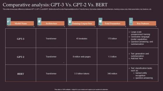 This slide showcases difference between GPT-3, GPT-2 and BERT Bidirectional Encoder Representations from Transformers. It provides detail about architecture, training corpus size, total parameters, key features, etc. Slidegeeks is one of the best resources for PowerPoint templates. You can download easily and regulate Comprehensive Resource Guide To Master GPT 3 Comparative Analysis GPT 3 Vs Gpt 2 Vs BERT Graphics PDF for your personal presentations from our wonderful collection. A few clicks is all it takes to discover and get the most relevant and appropriate templates. Use our Templates to add a unique zing and appeal to your presentation and meetings. All the slides are easy to edit and you can use them even for advertisement purposes.