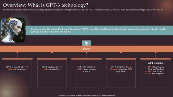 This slide showcases introduction to GPT 3 which can provide basic information to this third generation Generative Pre Trained Transformer technology. It provides details about machine learning parameters, characters, etc.  Presenting this PowerPoint presentation, titled Comprehensive Resource Guide To Master GPT 3 Overview What Is GPT 3 Technology Graphics PDF, with topics curated by our researchers after extensive research. This editable presentation is available for immediate download and provides attractive features when used. Download now and captivate your audience. Presenting this Comprehensive Resource Guide To Master GPT 3 Overview What Is GPT 3 Technology Graphics PDF. Our researchers have carefully researched and created these slides with all aspects taken into consideration. This is a completely customizable Comprehensive Resource Guide To Master GPT 3 Overview What Is GPT 3 Technology Graphics PDF that is available for immediate downloading. Download now and make an impact on your audience. Highlight the attractive features available with our PPTs.