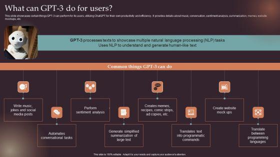 This slide showcases certain things GPT 3 can perform for its users, utilizing ChatGPT for their own productivity and efficiency. It provides details about music, conversation, sentiment analysis, summarization, memes, website mockups, etc. Create an editable Comprehensive Resource Guide To Master GPT 3 What Can GPT 3 Do For Users Background PDF that communicates your idea and engages your audience. Whether youre presenting a business or an educational presentation, pre designed presentation templates help save time. Comprehensive Resource Guide To Master GPT 3 What Can GPT 3 Do For Users Background PDF is highly customizable and very easy to edit, covering many different styles from creative to business presentations. Slidegeeks has creative team members who have crafted amazing templates. So, go and get them without any delay.