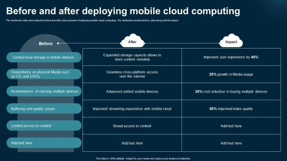 The mentioned slide showcase the before and after case scenario of deploying mobile cloud computing. The attributes includes before, after along with the impact. Do you have to make sure that everyone on your team knows about any specific topic I yes, then you should give Before And After Deploying Mobile Cloud Computing Application Areas Of Mobile Cloud Computing a try. Our experts have put a lot of knowledge and effort into creating this impeccable Before And After Deploying Mobile Cloud Computing Application Areas Of Mobile Cloud Computing. You can use this template for your upcoming presentations, as the slides are perfect to represent even the tiniest detail. You can download these templates from the Slidegeeks website and these are easy to edit. So grab these today The mentioned slide showcase the before and after case scenario of deploying mobile cloud computing. The attributes includes before, after along with the impact