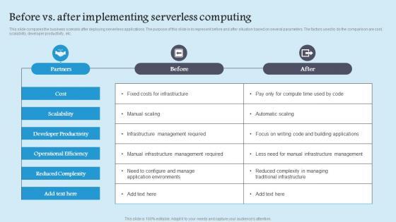 This slide compares the business scenario after deploying serverless applications. The purpose of this slide is to represent before and after situation based on several parameters. The factors used to do the comparison are cost, scalability, developer productivity, etc. If you are looking for a format to display your unique thoughts, then the professionally designed Before Vs After Implementing Role Serverless Computing Modern Technology Guidelines Pdf is the one for you. You can use it as a Google Slides template or a PowerPoint template. Incorporate impressive visuals, symbols, images, and other charts. Modify or reorganize the text boxes as you desire. Experiment with shade schemes and font pairings. Alter, share or cooperate with other people on your work. Download Before Vs After Implementing Role Serverless Computing Modern Technology Guidelines Pdf and find out how to give a successful presentation. Present a perfect display to your team and make your presentation unforgettable. This slide compares the business scenario after deploying serverless applications. The purpose of this slide is to represent before and after situation based on several parameters. The factors used to do the comparison are cost, scalability, developer productivity, etc.