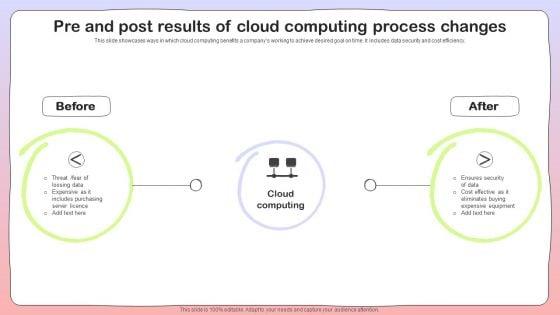 This slide showcases ways in which cloud computing benefits a companys working to achieve desired goal on time. It includes data security and cost efficiency. Persuade your audience using this Pre And Post Results Of Cloud Computing Process Changes Graphics PDF. This PPT design covers two stages, thus making it a great tool to use. It also caters to a variety of topics including Cloud Computing, Expensive Equipment, Includes Purchasing. Download this PPT design now to present a convincing pitch that not only emphasizes the topic but also showcases your presentation skills.