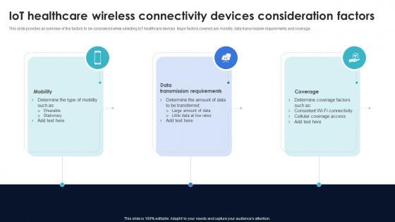 This slide provides an overview of the factors to be considered while selecting IoT healthcare devices. Major factors covered are mobility, data transmission requirements and coverage. Want to ace your presentation in front of a live audience Our Optimization Of IoT Remote Monitoring IoT Healthcare Wireless Connectivity Devices Consideration IoT SS V can help you do that by engaging all the users towards you. Slidegeeks experts have put their efforts and expertise into creating these impeccable powerpoint presentations so that you can communicate your ideas clearly. Moreover, all the templates are customizable, and easy-to-edit and downloadable. Use these for both personal and commercial use. This slide provides an overview of the factors to be considered while selecting IoT healthcare devices. Major factors covered are mobility, data transmission requirements and coverage.