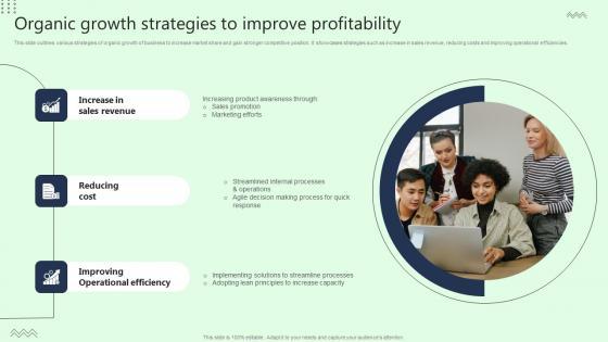 This slide outlines various strategies of organic growth of business to increase market share and gain stronger competitive position. It showcases strategies such as increase in sales revenue, reducing costs and improving operational efficiencies. Find a pre-designed and impeccable Organic Growth Strategies To Improve Profitability Guidelines PDF. The templates can ace your presentation without additional effort. You can download these easy-to-edit presentation templates to make your presentation stand out from others. So, what are you waiting for Download the template from Slidegeeks today and give a unique touch to your presentation.