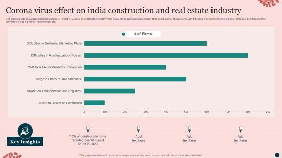 Showcasing this set of slides titled Corona Virus Effect On India Construction And Real Estate Industry Mockup PDF. The topics addressed in these templates are Industry, Key Insights, Construction. All the content presented in this PPT design is completely editable. Download it and make adjustments in color, background, font etc. as per your unique business setting.