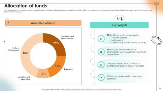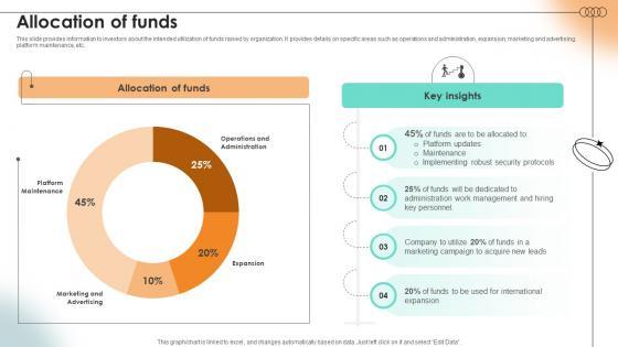 This slide provides information to investors about the intended utilization of funds raised by organization. It provides details on specific areas such as operations and administration, expansion, marketing and advertising, platform maintenance, etc. Find a pre-designed and impeccable Allocation Of Funds Content Marketing Platform Investor Funding Elevator Pitch Deck. The templates can ace your presentation without additional effort. You can download these easy-to-edit presentation templates to make your presentation stand out from others. So, what are you waiting for Download the template from Slidegeeks today and give a unique touch to your presentation. This slide provides information to investors about the intended utilization of funds raised by organization. It provides details on specific areas such as operations and administration, expansion, marketing and advertising, platform maintenance, etc.