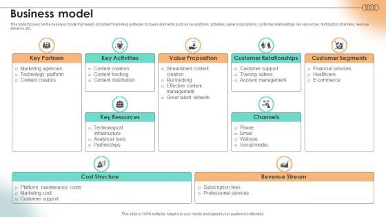 This slide focuses on the business model framework of content marketing software. It covers elements such as key partners, activities, value propositions, customer relationships, key resources, distribution channels, revenue streams, etc. Boost your pitch with our creative Business Model Content Marketing Platform Investor Funding Elevator Pitch Deck. Deliver an awe-inspiring pitch that will mesmerize everyone. Using these presentation templates you will surely catch everyones attention. You can browse the ppts collection on our website. We have researchers who are experts at creating the right content for the templates. So you do not have to invest time in any additional work. Just grab the template now and use them. This slide focuses on the business model framework of content marketing software. It covers elements such as key partners, activities, value propositions, customer relationships, key resources, distribution channels, revenue streams, etc.