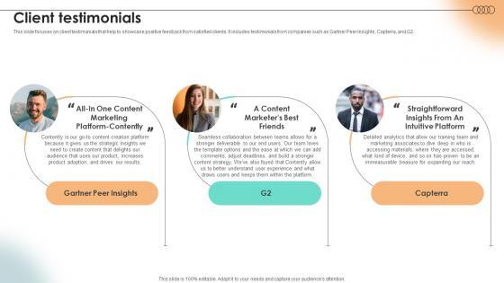 This slide focuses on client testimonials that help to showcase positive feedback from satisfied clients. It includes testimonials from companies such as Gartner Peer Insights, Capterra, and G2. Create an editable Client Testimonials Content Marketing Platform Investor Funding Elevator Pitch Deck that communicates your idea and engages your audience. Whether you are presenting a business or an educational presentation, pre-designed presentation templates help save time. Client Testimonials Content Marketing Platform Investor Funding Elevator Pitch Deck is highly customizable and very easy to edit, covering many different styles from creative to business presentations. Slidegeeks has creative team members who have crafted amazing templates. So, go and get them without any delay. This slide focuses on client testimonials that help to showcase positive feedback from satisfied clients. It includes testimonials from companies such as Gartner Peer Insights, Capterra, and G2.