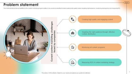 This slide exhibits problems identified by the content marketing program platform. Key problems identified include creating high-quality content, targeting right audience, monitoring all programs, and measuring ROI. Coming up with a presentation necessitates that the majority of the effort goes into the content and the message you intend to convey. The visuals of a PowerPoint presentation can only be effective if it supplements and supports the story that is being told. Keeping this in mind our experts created Problem Statement Content Marketing Platform Investor Funding Elevator Pitch Deck to reduce the time that goes into designing the presentation. This way, you can concentrate on the message while our designers take care of providing you with the right template for the situation. This slide exhibits problems identified by the content marketing program platform. Key problems identified include creating high-quality content, targeting right audience, monitoring all programs, and measuring ROI.