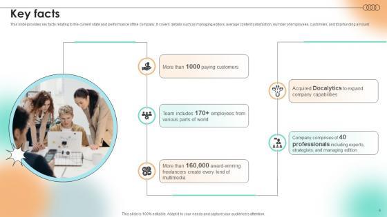 This slide provides key facts relating to the current state and performance of the company. It covers details such as managing editors, average content satisfaction, number of employees, customers, and total funding amount. If you are looking for a format to display your unique thoughts, then the professionally designed Key Facts Content Marketing Platform Investor Funding Elevator Pitch Deck is the one for you. You can use it as a Google Slides template or a PowerPoint template. Incorporate impressive visuals, symbols, images, and other charts. Modify or reorganize the text boxes as you desire. Experiment with shade schemes and font pairings. Alter, share or cooperate with other people on your work. Download Key Facts Content Marketing Platform Investor Funding Elevator Pitch Deck and find out how to give a successful presentation. Present a perfect display to your team and make your presentation unforgettable. This slide provides key facts relating to the current state and performance of the company. It covers details such as managing editors, average content satisfaction, number of employees, customers, and total funding amount.