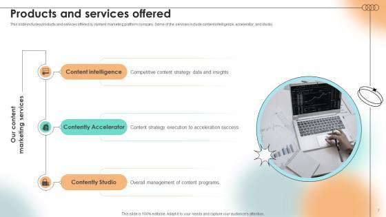 This slide includes products and services offered by content marketing platform company. Some of the services include content intelligence, accelerator, and studio. This modern and well-arranged Products And Services Offered Content Marketing Platform Investor Funding Elevator Pitch Deck provides lots of creative possibilities. It is very simple to customize and edit with the Powerpoint Software. Just drag and drop your pictures into the shapes. All facets of this template can be edited with Powerpoint, no extra software is necessary. Add your own material, put your images in the places assigned for them, adjust the colors, and then you can show your slides to the world, with an animated slide included. This slide includes products and services offered by content marketing platform company. Some of the services include content intelligence, accelerator, and studio.