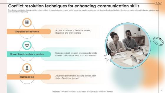 This slide represents developing conflict resolution skills techniques for leading stronger relationship and productive environment in professional settings. It includes elements such as emotional intelligence, patience, open communication and positivity. There are so many reasons you need a Conflict Resolution Techniques Content Marketing Platform Investor Funding Elevator Pitch Deck. The first reason is you can not spend time making everything from scratch, Thus, Slidegeeks has made presentation templates for you too. You can easily download these templates from our website easily. This slide represents developing conflict resolution skills techniques for leading stronger relationship and productive environment in professional settings. It includes elements such as emotional intelligence, patience, open communication and positivity.