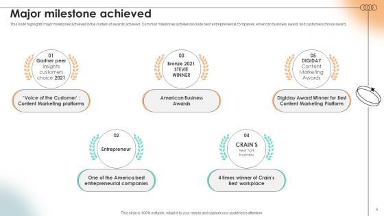 This slide highlights major milestones achieved in the context of awards achieved. Common milestones achieved include best entrepreneurial companies, American business award, and customers choice award. Are you in need of a template that can accommodate all of your creative concepts This one is crafted professionally and can be altered to fit any style. Use it with Google Slides or PowerPoint. Include striking photographs, symbols, depictions, and other visuals. Fill, move around, or remove text boxes as desired. Test out color palettes and font mixtures. Edit and save your work, or work with colleagues. Download Major Milestone Achieved Content Marketing Platform Investor Funding Elevator Pitch Deck and observe how to make your presentation outstanding. Give an impeccable presentation to your group and make your presentation unforgettable. This slide highlights major milestones achieved in the context of awards achieved. Common milestones achieved include best entrepreneurial companies, American business award, and customers choice award.