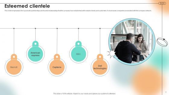 This slide emphasizes the successful partnerships and trusted relationships that the company has established with notable clients and customers. It showcases companies associated with the company network. From laying roadmaps to briefing everything in detail, our templates are perfect for you. You can set the stage with your presentation slides. All you have to do is download these easy-to-edit and customizable templates. Esteemed Clientele Content Marketing Platform Investor Funding Elevator Pitch Deck will help you deliver an outstanding performance that everyone would remember and praise you for. Do download this presentation today. This slide emphasizes the successful partnerships and trusted relationships that the company has established with notable clients and customers. It showcases companies associated with the company network.
