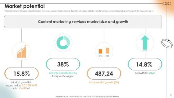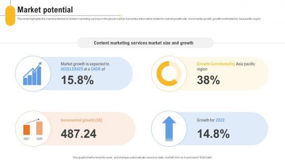This slide highlights the market potential of content marketing services in the global market. It provides information related to market growth rate, incremental growth, growth contributed by Asia pacific region. Are you in need of a template that can accommodate all of your creative concepts This one is crafted professionally and can be altered to fit any style. Use it with Google Slides or PowerPoint. Include striking photographs, symbols, depictions, and other visuals. Fill, move around, or remove text boxes as desired. Test out color palettes and font mixtures. Edit and save your work, or work with colleagues. Download Market Potential Content Management Platform Investor Funding Elevator Pitch Deck and observe how to make your presentation outstanding. Give an impeccable presentation to your group and make your presentation unforgettable. This slide highlights the market potential of content marketing services in the global market. It provides information related to market growth rate, incremental growth, growth contributed by Asia pacific region.