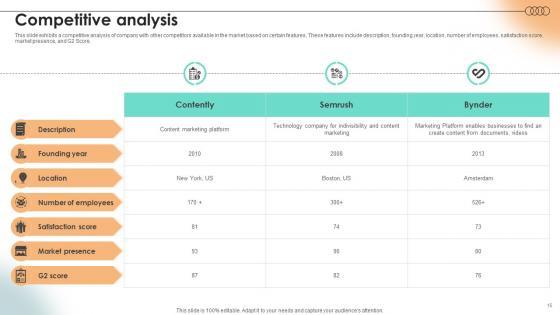 This slide exhibits a competitive analysis of company with other competitors available in the market based on certain features. These features include description, founding year, location, number of employees, satisfaction score, market presence, and G2 Score. Want to ace your presentation in front of a live audience Our Competitive Analysis Content Marketing Platform Investor Funding Elevator Pitch Deck can help you do that by engaging all the users towards you. Slidegeeks experts have put their efforts and expertise into creating these impeccable powerpoint presentations so that you can communicate your ideas clearly. Moreover, all the templates are customizable, and easy-to-edit and downloadable. Use these for both personal and commercial use. This slide exhibits a competitive analysis of company with other competitors available in the market based on certain features. These features include description, founding year, location, number of employees, satisfaction score, market presence, and G2 Score.