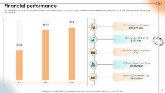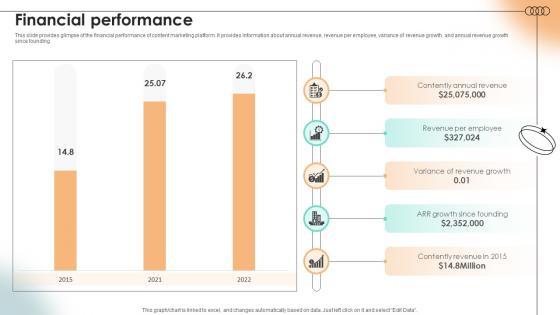 This slide provides glimpse of the financial performance of content marketing platform. It provides information about annual revenue, revenue per employee, variance of revenue growth, and annual revenue growth since founding. Slidegeeks is here to make your presentations a breeze with Financial Performance Content Marketing Platform Investor Funding Elevator Pitch Deck With our easy-to-use and customizable templates, you can focus on delivering your ideas rather than worrying about formatting. With a variety of designs to choose from, you are sure to find one that suits your needs. And with animations and unique photos, illustrations, and fonts, you can make your presentation pop. So whether you are giving a sales pitch or presenting to the board, make sure to check out Slidegeeks first This slide provides glimpse of the financial performance of content marketing platform. It provides information about annual revenue, revenue per employee, variance of revenue growth, and annual revenue growth since founding.