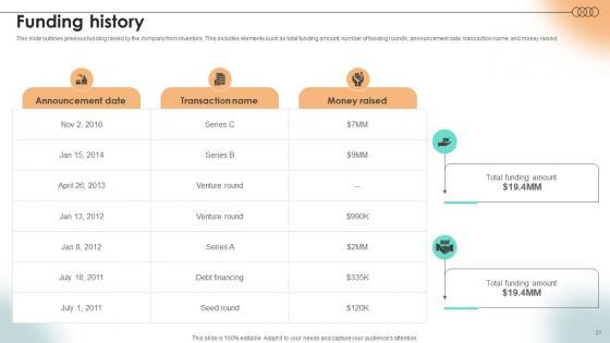 This slide outlines previous funding raised by the company from investors. This includes elements such as total funding amount, number of funding rounds, announcement date, transaction name, and money raised. Whether you have daily or monthly meetings, a brilliant presentation is necessary. Funding History Content Marketing Platform Investor Funding Elevator Pitch Deck can be your best option for delivering a presentation. Represent everything in detail using Funding History Content Marketing Platform Investor Funding Elevator Pitch Deck and make yourself stand out in meetings. The template is versatile and follows a structure that will cater to your requirements. All the templates prepared by Slidegeeks are easy to download and edit. Our research experts have taken care of the corporate themes as well. So, give it a try and see the results. This slide outlines previous funding raised by the company from investors. This includes elements such as total funding amount, number of funding rounds, announcement date, transaction name, and money raised.