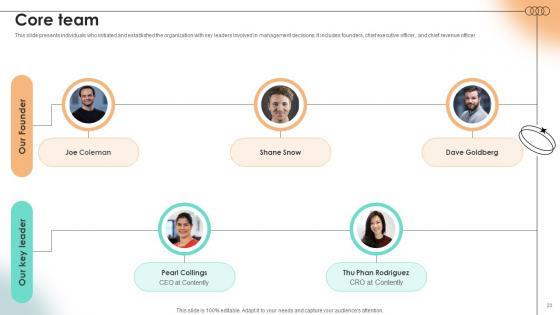 This slide presents individuals who initiated and established the organization with key leaders involved in management decisions. It includes founders, chief executive officer, and chief revenue officer. Get a simple yet stunning designed Core Team Content Marketing Platform Investor Funding Elevator Pitch Deck. It is the best one to establish the tone in your meetings. It is an excellent way to make your presentations highly effective. So, download this PPT today from Slidegeeks and see the positive impacts. Our easy-to-edit Core Team Content Marketing Platform Investor Funding Elevator Pitch Deck can be your go-to option for all upcoming conferences and meetings. So, what are you waiting for Grab this template today. This slide presents individuals who initiated and established the organization with key leaders involved in management decisions. It includes founders, chief executive officer, and chief revenue officer.