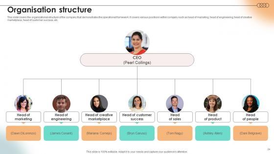 This slide covers the organizational structure of the company that demonstrates the operational framework. It covers various positions within company such as head of marketing, head of engineering, head of creative marketplace, head of customer success, etc. Make sure to capture your audiences attention in your business displays with our gratis customizable Organisation Structure Content Marketing Platform Investor Funding Elevator Pitch Deck. These are great for business strategies, office conferences, capital raising or task suggestions. If you desire to acquire more customers for your tech business and ensure they stay satisfied, create your own sales presentation with these plain slides. This slide covers the organizational structure of the company that demonstrates the operational framework. It covers various positions within company such as head of marketing, head of engineering, head of creative marketplace, head of customer success, etc.