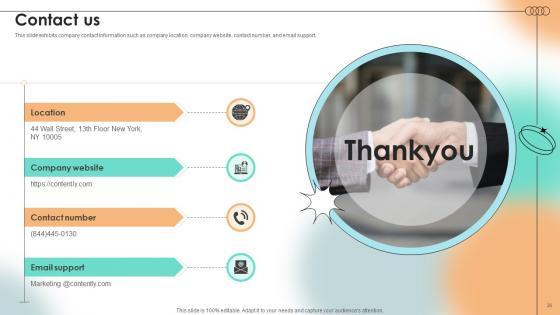 This slide exhibits company contact information such as company location, company website, contact number, and email support. Do you have to make sure that everyone on your team knows about any specific topic I yes, then you should give Contact Us Content Marketing Platform Investor Funding Elevator Pitch Deck a try. Our experts have put a lot of knowledge and effort into creating this impeccable Contact Us Content Marketing Platform Investor Funding Elevator Pitch Deck. You can use this template for your upcoming presentations, as the slides are perfect to represent even the tiniest detail. You can download these templates from the Slidegeeks website and these are easy to edit. So grab these today This slide exhibits company contact information such as company location, company website, contact number, and email support.