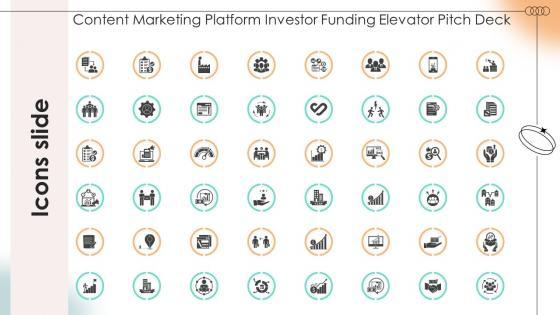 Find highly impressive Icons Slide Content Marketing Platform Investor Funding Elevator Pitch Deck on Slidegeeks to deliver a meaningful presentation. You can save an ample amount of time using these presentation templates. No need to worry to prepare everything from scratch because Slidegeeks experts have already done a huge research and work for you. You need to download Icons Slide Content Marketing Platform Investor Funding Elevator Pitch Deck for your upcoming presentation. All the presentation templates are 100 percent editable and you can change the color and personalize the content accordingly. Download now Our Icons Slide Content Marketing Platform Investor Funding Elevator Pitch Deck are topically designed to provide an attractive backdrop to any subject. Use them to look like a presentation pro.