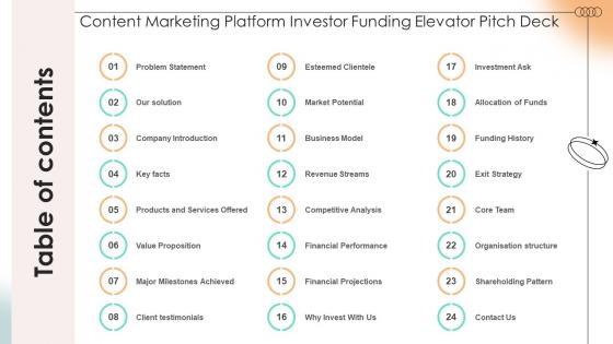 Explore a selection of the finest Table Of Contents Content Marketing Platform Investor Funding Elevator Pitch Deck here. With a plethora of professionally designed and pre-made slide templates, you can quickly and easily find the right one for your upcoming presentation. You can use our Table Of Contents Content Marketing Platform Investor Funding Elevator Pitch Deck to effectively convey your message to a wider audience. Slidegeeks has done a lot of research before preparing these presentation templates. The content can be personalized and the slides are highly editable. Grab templates today from Slidegeeks. Our Table Of Contents Content Marketing Platform Investor Funding Elevator Pitch Deck are topically designed to provide an attractive backdrop to any subject. Use them to look like a presentation pro.