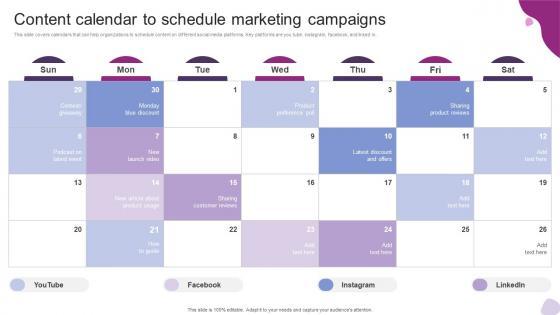 This slide covers calendars that can help organizations to schedule content on different social media platforms. Key platforms are you tube, instagram, facebook, and linked in. From laying roadmaps to briefing everything in detail, our templates are perfect for you. You can set the stage with your presentation slides. All you have to do is download these easy-to-edit and customizable templates. Content Calendar To Schedule Marketing Campaigns Powerful Marketing Techniques Strategy SS V will help you deliver an outstanding performance that everyone would remember and praise you for. Do download this presentation today. This slide covers calendars that can help organizations to schedule content on different social media platforms. Key platforms are you tube, instagram, facebook, and linked in.