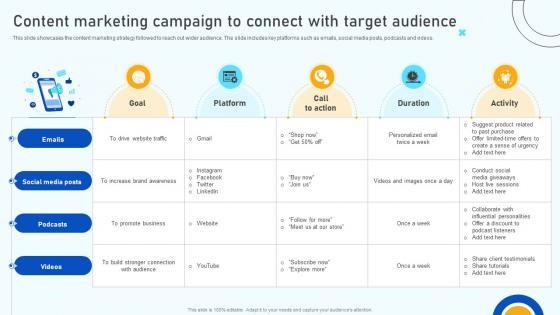 This slide showcases the content marketing strategy followed to reach out wider audience. The slide includes key platforms such as emails, social media posts, podcasts and videos. There are so many reasons you need a Digital Marketing Strategies Content Marketing Campaign To Connect With Target SA SS V. The first reason is you can not spend time making everything from scratch, Thus, Slidegeeks has made presentation templates for you too. You can easily download these templates from our website easily. This slide showcases the content marketing strategy followed to reach out wider audience. The slide includes key platforms such as emails, social media posts, podcasts and videos.