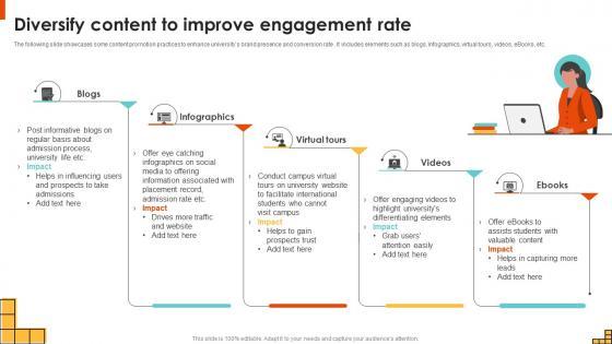 The following slide showcases some content promotion practices to enhance universitys brand presence and conversion rate . It includes elements such as blogs, infographics, virtual tours, videos, eBooks, etc. Coming up with a presentation necessitates that the majority of the effort goes into the content and the message you intend to convey. The visuals of a PowerPoint presentation can only be effective if it supplements and supports the story that is being told. Keeping this in mind our experts created Diversify Content To Improve Engagement Rate Running Marketing Campaigns Strategy SS V to reduce the time that goes into designing the presentation. This way, you can concentrate on the message while our designers take care of providing you with the right template for the situation. The following slide showcases some content promotion practices to enhance universitys brand presence and conversion rate . It includes elements such as blogs, infographics, virtual tours, videos, eBooks, etc.