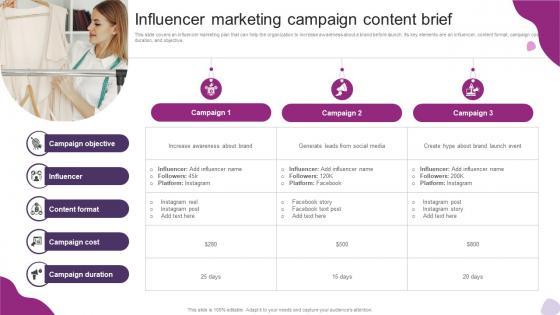 This slide covers an influencer marketing plan that can help the organization to increase awareness about a brand before launch. Its key elements are an influencer, content format, campaign cost, duration, and objective. Crafting an eye-catching presentation has never been more straightforward. Let your presentation shine with this tasteful yet straightforward Influencer Marketing Campaign Content Brief Powerful Marketing Techniques Strategy SS V template. It offers a minimalistic and classy look that is great for making a statement. The colors have been employed intelligently to add a bit of playfulness while still remaining professional. Construct the ideal Influencer Marketing Campaign Content Brief Powerful Marketing Techniques Strategy SS V that effortlessly grabs the attention of your audience Begin now and be certain to wow your customers This slide covers an influencer marketing plan that can help the organization to increase awareness about a brand before launch. Its key elements are an influencer, content format, campaign cost, duration, and objective.