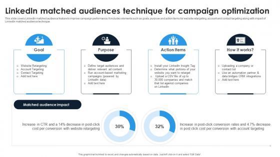This slide covers LinkedIn matched audience feature to improve campaign performance. It includes elements such as goals, purpose and action items for website retargeting, account and contact targeting along with impact of LinkedIn matched audience technique. Welcome to our selection of the Linkedin Content Strategies Linkedin Matched Audiences Technique For Campaign MKT SS V. These are designed to help you showcase your creativity and bring your sphere to life. Planning and Innovation are essential for any business that is just starting out. This collection contains the designs that you need for your everyday presentations. All of our PowerPoints are 100Percent editable, so you can customize them to suit your needs. This multi-purpose template can be used in various situations. Grab these presentation templates today. This slide covers LinkedIn matched audience feature to improve campaign performance. It includes elements such as goals, purpose and action items for website retargeting, account and contact targeting along with impact of LinkedIn matched audience technique.