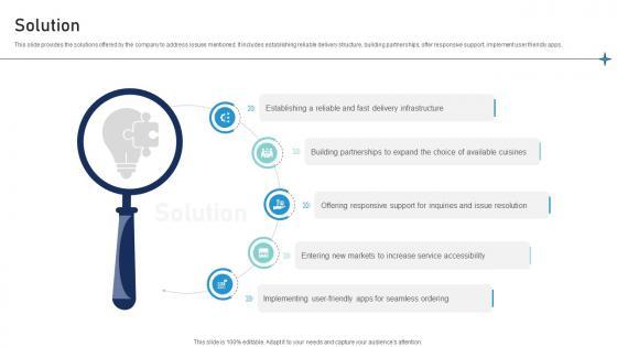 This slide provides the solutions offered by the company to address issues mentioned. It includes establishing reliable delivery structure, building partnerships, offer responsive support, implement user friendly apps. If your project calls for a presentation, then Slidegeeks is your go-to partner because we have professionally designed, easy-to-edit templates that are perfect for any presentation. After downloading, you can easily edit Solution Provisions Conveyance Business Model BMC SS V and make the changes accordingly. You can rearrange slides or fill them with different images. Check out all the handy templates This slide provides the solutions offered by the company to address issues mentioned. It includes establishing reliable delivery structure, building partnerships, offer responsive support, implement user friendly apps.