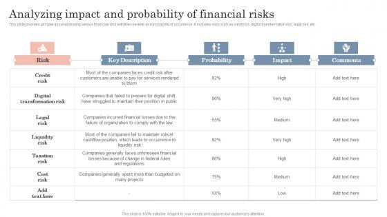 This slide provides glimpse about assessing various financial risks with their severity and probability of occurrence. It includes risks such as credit risk, digital transformation risk, legal risk, etc.Get a simple yet stunning designed Analyzing Impact And Probability Of Guide To Corporate Financial Growth Plan Diagrams Pdf. It is the best one to establish the tone in your meetings. It is an excellent way to make your presentations highly effective. So, download this PPT today from Slidegeeks and see the positive impacts. Our easy-to-edit Analyzing Impact And Probability Of Guide To Corporate Financial Growth Plan Diagrams Pdf can be your go-to option for all upcoming conferences and meetings. So, what are you waiting for Grab this template today. This slide provides glimpse about assessing various financial risks with their severity and probability of occurrence. It includes risks such as credit risk, digital transformation risk, legal risk, etc.