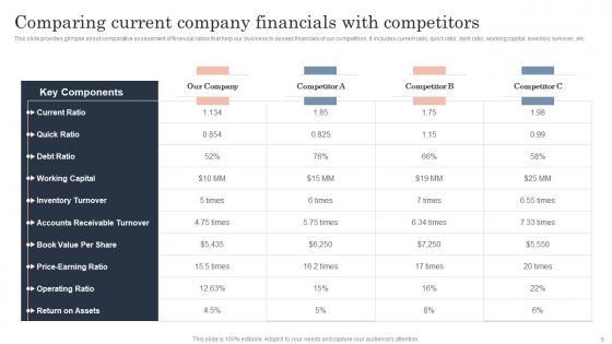 This slide provides glimpse about comparative assessment of financial ratios that help our business to assess financials of our competitors. It includes current ratio, quick ratio, debt ratio, working capital, inventory turnover, etc.Crafting an eye-catching presentation has never been more straightforward. Let your presentation shine with this tasteful yet straightforward Comparing Current Company Financials With Guide To Corporate Financial Growth Plan Icons Pdf template. It offers a minimalistic and classy look that is great for making a statement. The colors have been employed intelligently to add a bit of playfulness while still remaining professional. Construct the ideal Comparing Current Company Financials With Guide To Corporate Financial Growth Plan Icons Pdf that effortlessly grabs the attention of your audience. Begin now and be certain to wow your customers. This slide provides glimpse about comparative assessment of financial ratios that help our business to assess financials of our competitors. It includes current ratio, quick ratio, debt ratio, working capital, inventory turnover, etc.
