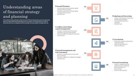 This slide provides glimpse about six areas of financial planning and management that can improve financial standing of our company. It includes phases such as financial decisions, budgeting and forecasting, working capital management, etc.There are so many reasons you need a Understanding Areas Of Financial Strategy And Guide To Corporate Financial Growth Plan Mockup Pdf. The first reason is you can not spend time making everything from scratch, Thus, Slidegeeks has made presentation templates for you too. You can easily download these templates from our website easily. This slide provides glimpse about six areas of financial planning and management that can improve financial standing of our company. It includes phases such as financial decisions, budgeting and forecasting, working capital management, etc.