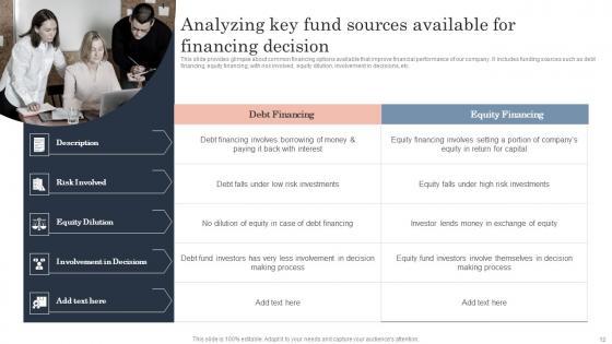 This slide provides glimpse about common financing options available that improve financial performance of our company. It includes funding sources such as debt financing, equity financing, with risk involved, equity dilution, involvement in decisions, etc.Present like a pro with Analyzing Key Fund Sources Available For Guide To Corporate Financial Growth Plan Formats Pdf Create beautiful presentations together with your team, using our easy-to-use presentation slides. Share your ideas in real-time and make changes on the fly by downloading our templates. So whether you are in the office, on the go, or in a remote location, you can stay in sync with your team and present your ideas with confidence. With Slidegeeks presentation got a whole lot easier. Grab these presentations today. This slide provides glimpse about common financing options available that improve financial performance of our company. It includes funding sources such as debt financing, equity financing, with risk involved, equity dilution, involvement in decisions, etc.