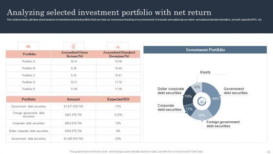 This slide provides glimpse about analysis of selected investment portfolio that can help our business in tracking of our investment. It includes annualized gross return, annualized standard deviation, amount, expected ROI, etc.Slidegeeks is here to make your presentations a breeze with Analyzing Selected Investment Portfolio With Guide To Corporate Financial Growth Plan Designs Pdf With our easy-to-use and customizable templates, you can focus on delivering your ideas rather than worrying about formatting. With a variety of designs to choose from, you are sure to find one that suits your needs. And with animations and unique photos, illustrations, and fonts, you can make your presentation pop. So whether you are giving a sales pitch or presenting to the board, make sure to check out Slidegeeks first. This slide provides glimpse about analysis of selected investment portfolio that can help our business in tracking of our investment. It includes annualized gross return, annualized standard deviation, amount, expected ROI, etc.